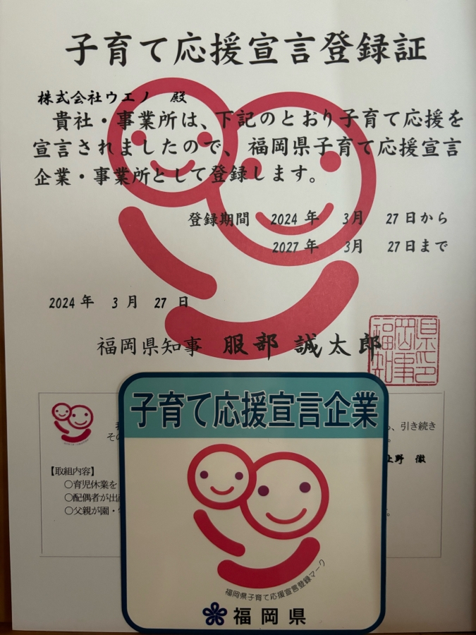 でおなじみの株式会社ウエノは、子育て応援宣言登録証を
